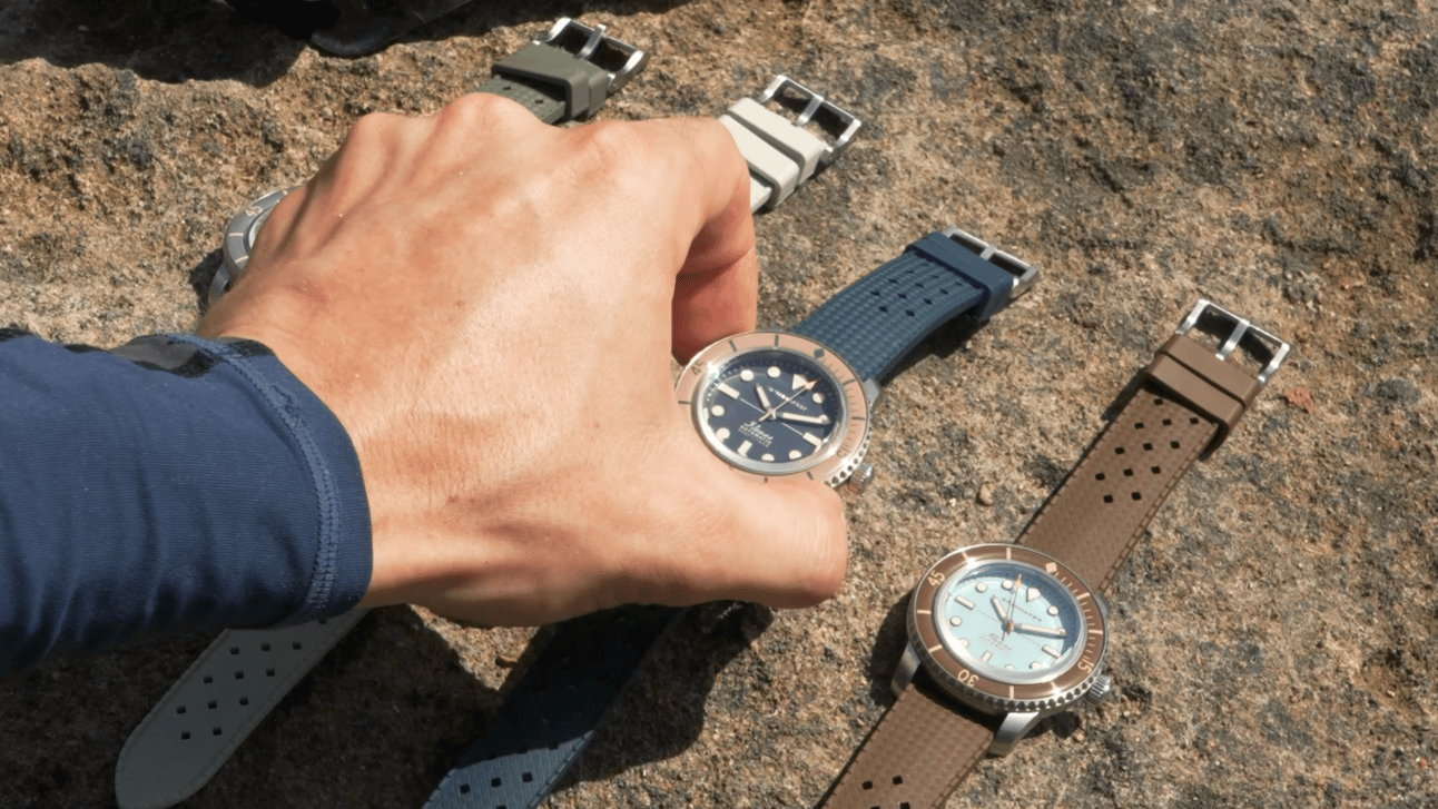 These watches arrive on a 20mm stainless steel bead of rice bracelet, but also include a rubber strap option in case you want to switch things up! 🏄